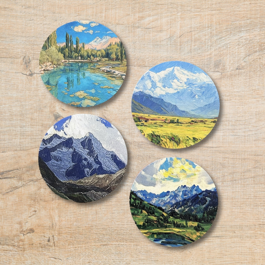 This exclusive set captures the epic scale and rich textures of Northern Pakistan's most breathtaking landscapes, rendered in expressive, painterly styles. It features the majesty of the Nanga Parbat and Rakaposhi mountains and the sweeping serenity of Deosai Plains and Skardu. Each coaster transforms a classic natural vista, from glacial peaks to sunny meadows, into a functional piece of art for your desk or coffee table.