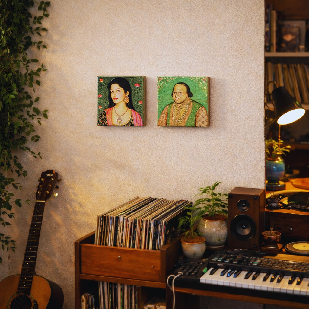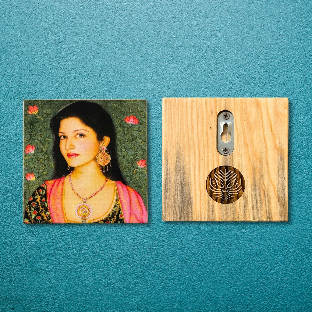 A timeless tribute to Nazia Hasan, reimagined in the delicate grace of Mughal miniature art. Printed on a finely crafted wooden block, this piece celebrates her iconic charm through rich patterns, soft florals, and a touch of nostalgia. Perfect for any music or art lover’s space.