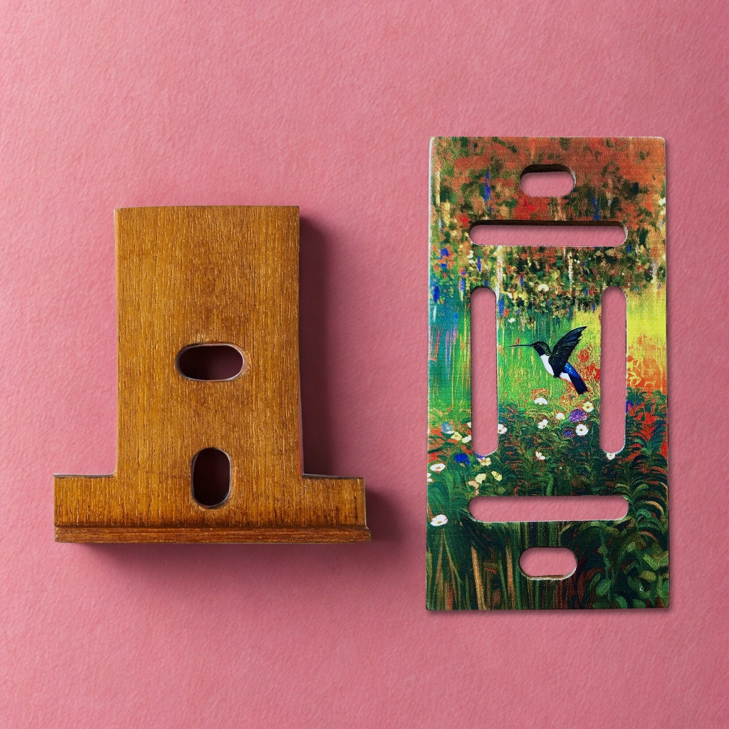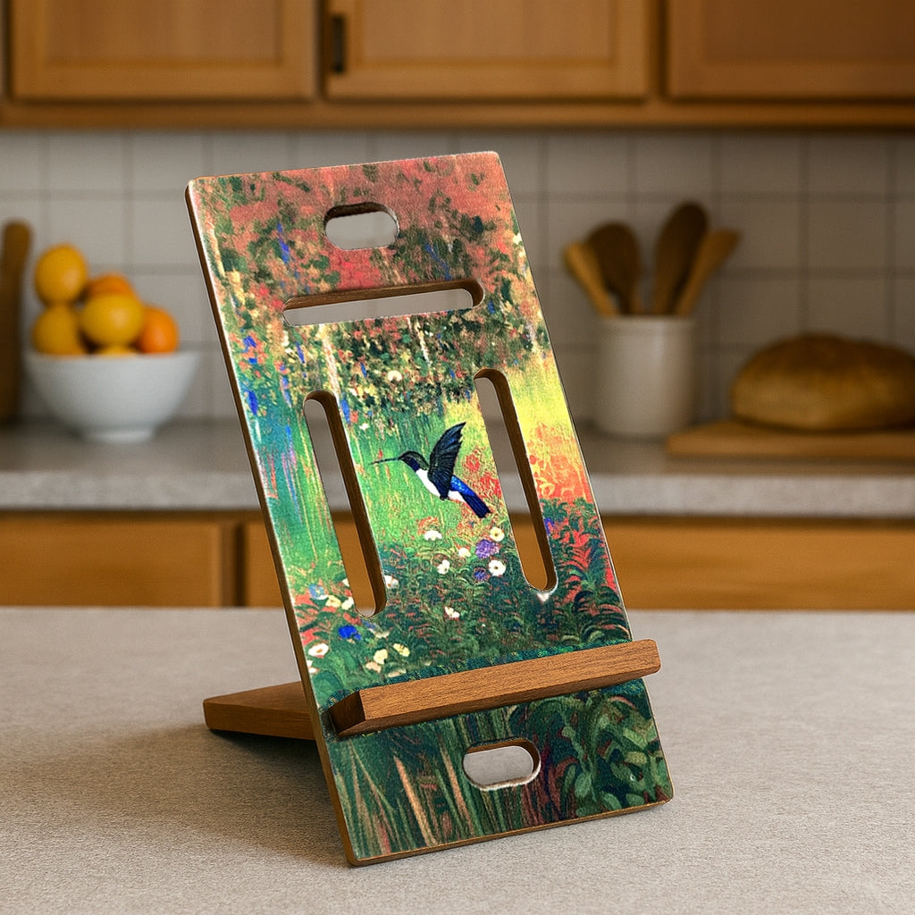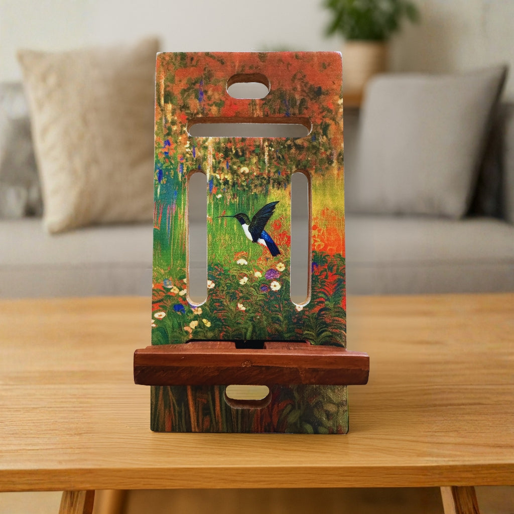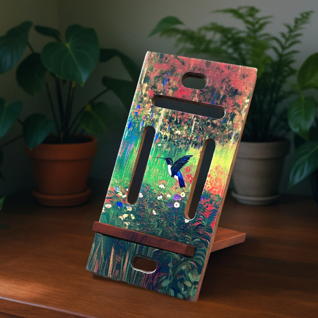 Forget boring plastic, this wooden phone stand is designed to merge the natural world with modern artistry. The dynamic, highly saturated scene features a solitary hummingbird in flight, set against a stunning backdrop of painterly color shifts that define its unique, expressive style.
